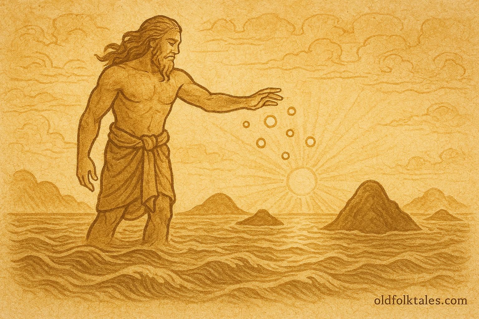 In the earliest time, before there were lands or people, there was only the endless expanse of the ocean, a vast, shimmering mirror stretching to every horizon. Its waters moved gently, rippling with the rhythm of the winds that swept across its surface. There were no shores, no mountains, no birds, and no fish, only the eternal sea beneath the vault of heaven.